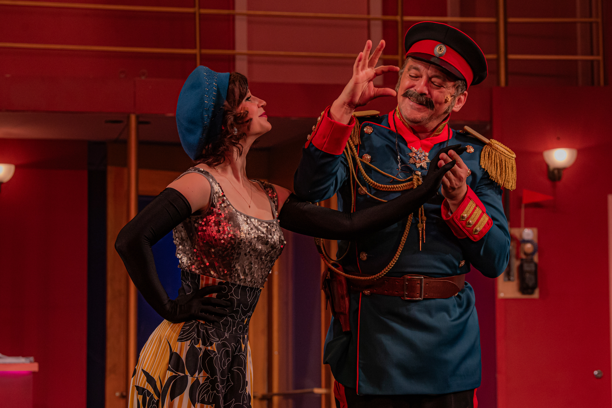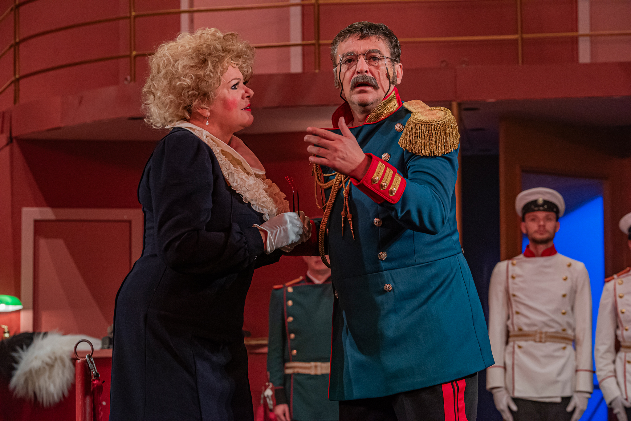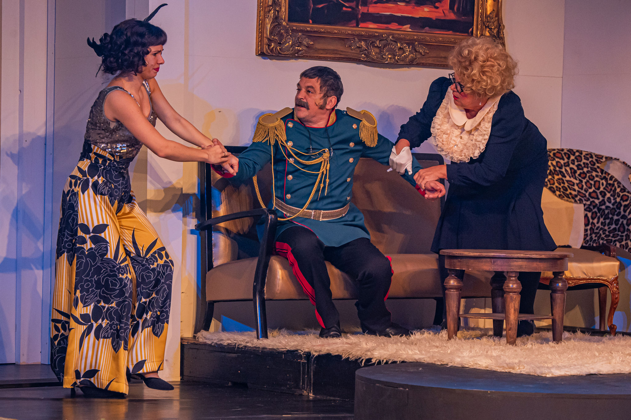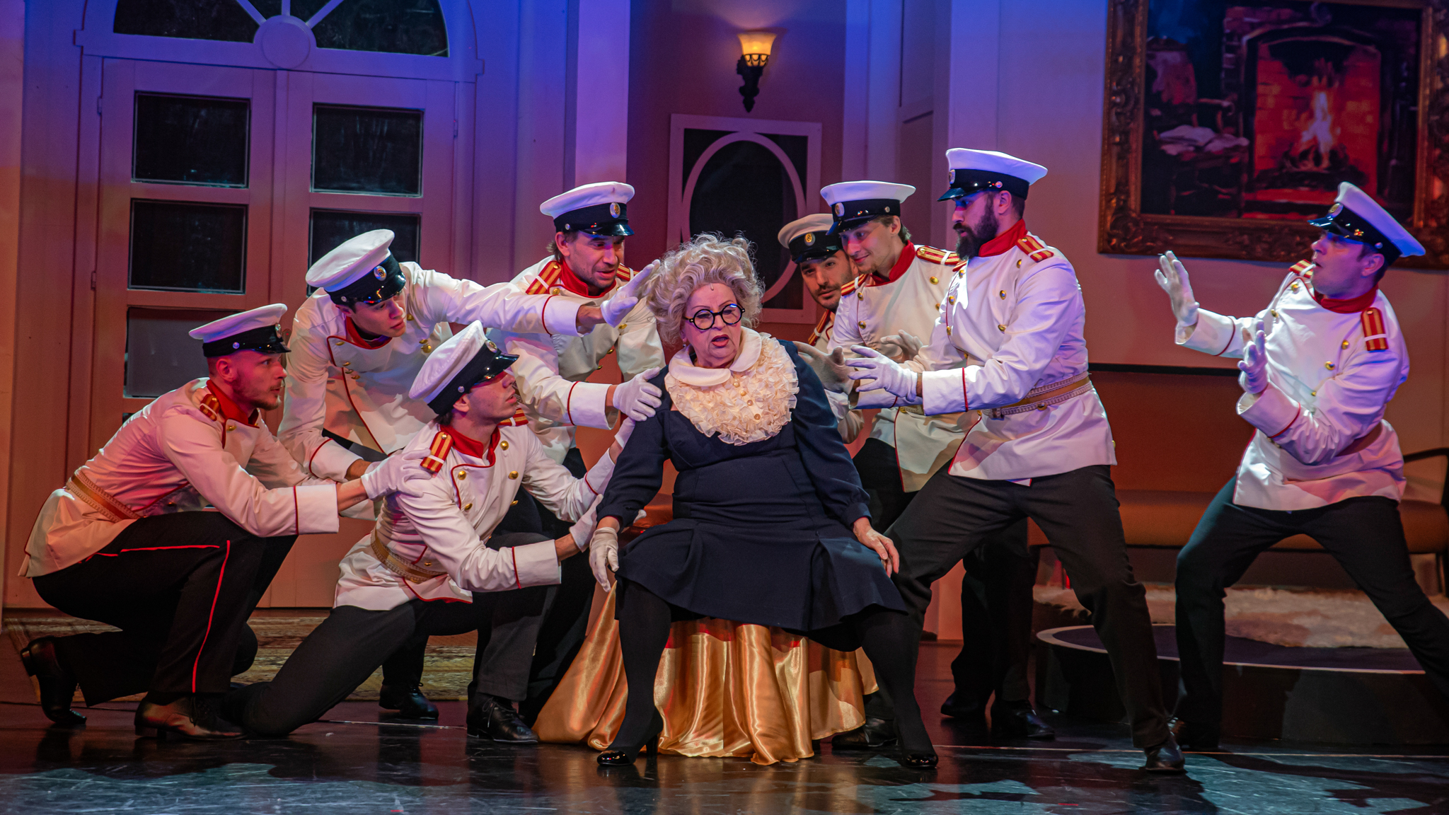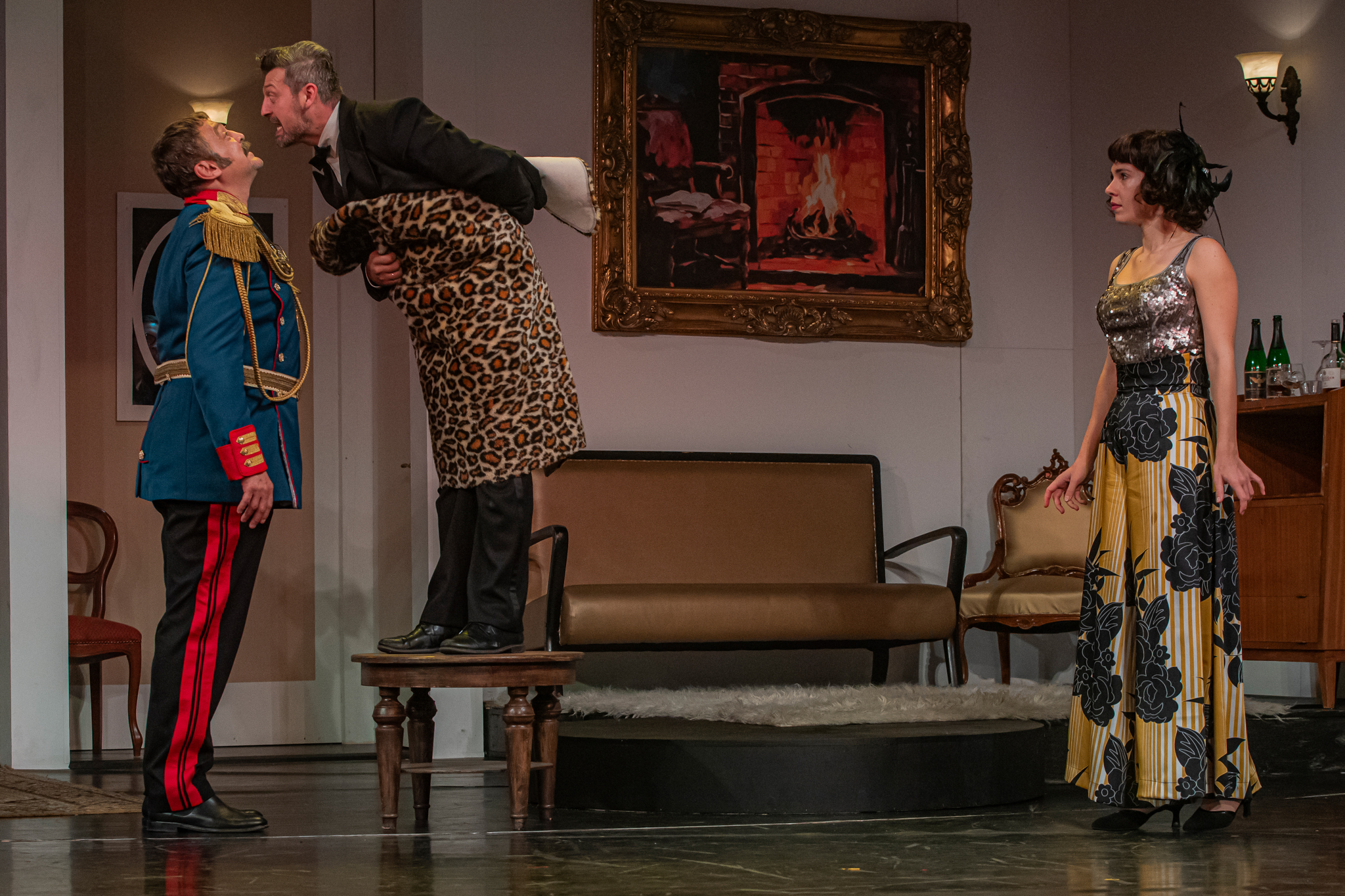 És emellett ott van Poire, a neurotikus impresszárió, pragmatikus nejével az oldalán, aki azért fohászkodik, hogy ha már egyeseknek ilyen elmebaj ez a szerelem-dolog, akkor legalább ne kellene frászban élni, előadásokat lemondani, igazodva a művésznő viharos magánéletéhez. Hogy mindeközben egy agyament Kormányzó is üldözi Sybillt, a Kormányzót meg a helyi nőegylet vezetője, az már szinte természetes. Ahogy természetesen medvében sem lesz hiány.