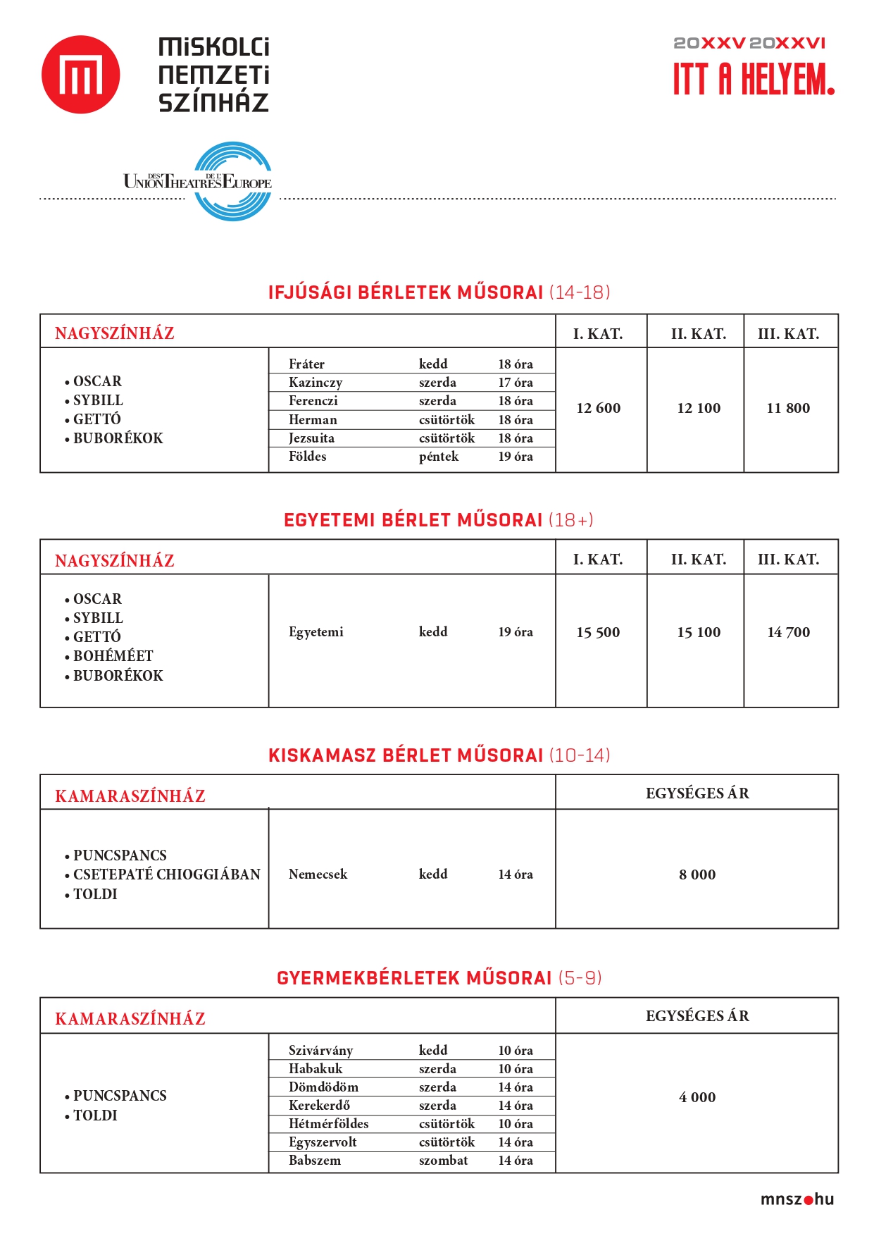 Csoportos bérletrendelésért keresse a jegyirodát vagy szervezőinket: